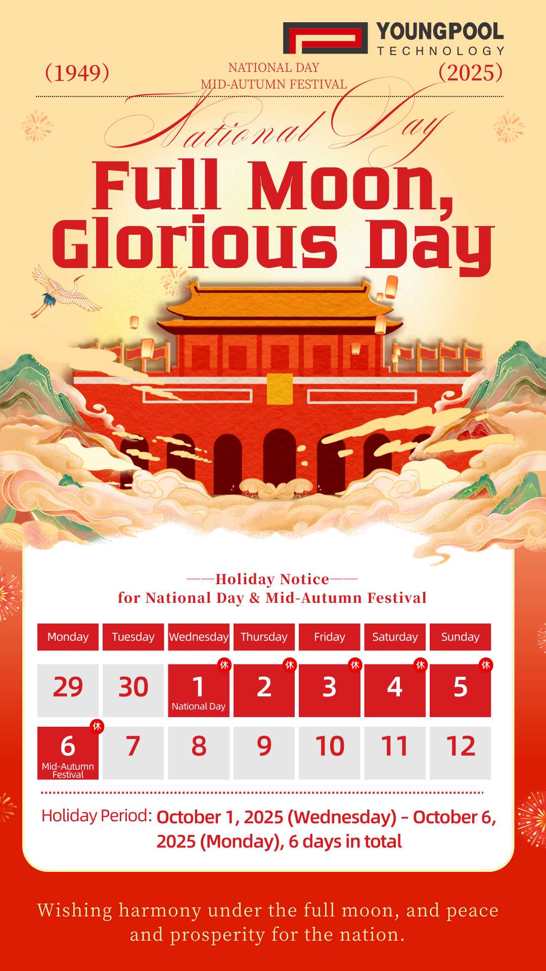 ประกาศวันหยุดวันชาติและเทศกาลไหว้พระจันทร์ของ Youngpool Technology